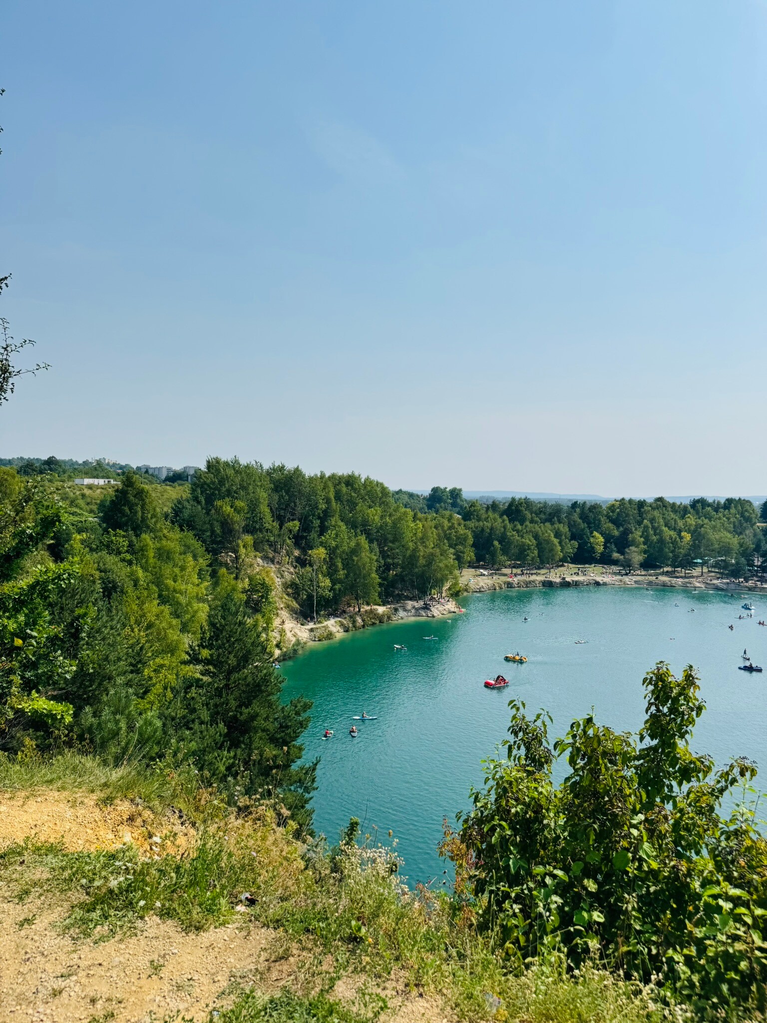 Malowniczy zalew – turkusowa woda i piaszczysta plaża w dawnym kamieniołomie.